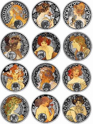• Серебряные, памятные монеты из серии "А. Муха Знаки Зодиака (состоящий из 12 монет) , выпущены Филателическим и нумизматическим Бюро Ниуэ , являющимся официальным эмиссионным органом Правительства Острова Ниуэ , в связи со 150 годовщиной со дня рождения этого великого художника.