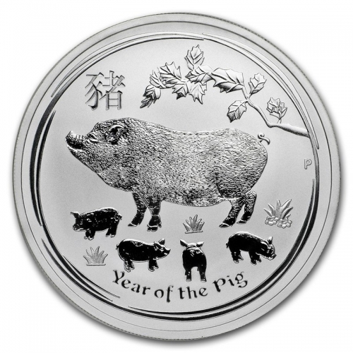 Серебряная монета со Свиньёй является двенадцатой монетой в серии Лунар 2. В китайском лунном календаре символом 2019 года является Свинья. На реверсе монеты изображены свинья и 4 поросёнка в листве. Также присутствуют китайский иероглиф обозначающий "Свинья", надпись "Год Свиньи" и значок монетного двора города Перт. На аверсе монет изображён портрет королевы Великобритании Елизаветы II.