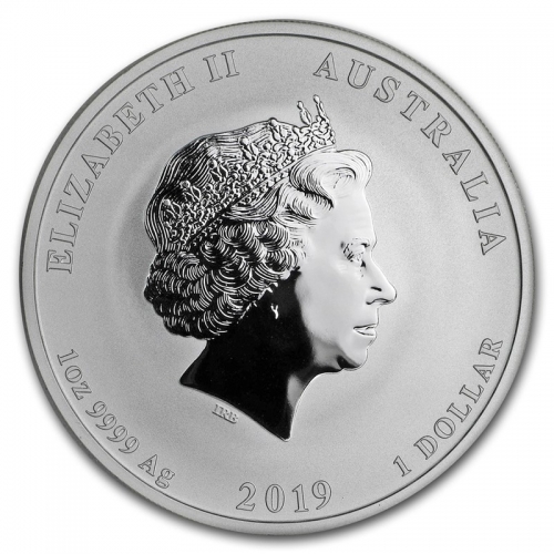 На аверсе изображен профиль королевы Елизаветы II. Сверху надписи: «ELIZABETH II» (Елизавета II) и «AUSTRALIA» (Австралия). Также внизу указаны вес (1 oz - 1 унция), проба (9999), название металла (Ag - серебро), год выпуска (2019) и номинал монеты – 1 австралийский доллар.