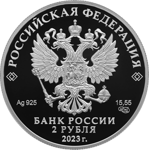 рельефное изображение Государственного герба Российской Федерации, над ним вдоль канта – надпись полукругом: «РОССИЙСКАЯ ФЕДЕРАЦИЯ», обрамленная с обеих сторон сдвоенными ромбами, под гербом: слева – обозначения драгоценного металла и пробы сплава, справа – содержание химически чистого металла и товарный знак монетного двора, внизу в центре в три строки – надпись: «БАНК РОССИИ», номинал монеты: «2 РУБЛЯ», год выпуска: «2023 г.».