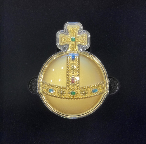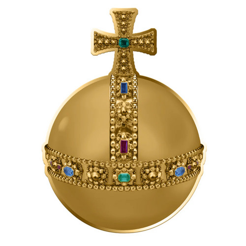 • Крест на сфере символизирует христианский мир, а полосы хрустальных вставок, разделяющие сферу на три части, указывают на три континента, известные в средние века.
