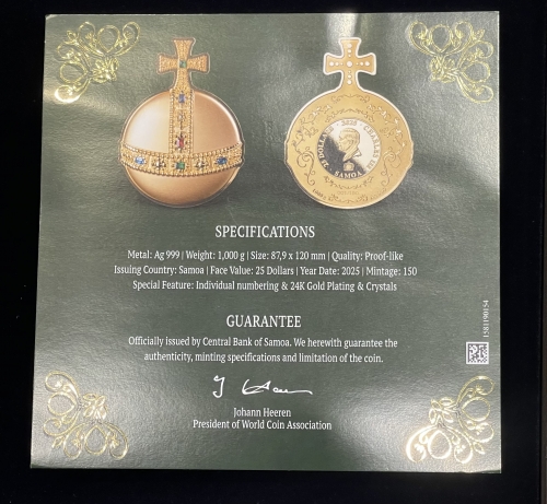 Серебряная монета 25 долларов 2025 год "Королевская держава" Ag 999, 1000 г., тираж 150 шт