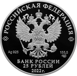 рельефное изображение Государственного герба Российской Федерации, над ним вдоль канта – надпись полукругом: «РОССИЙСКАЯ ФЕДЕРАЦИЯ», обрамленная с обеих сторон сдвоенными ромбами, под гербом: слева – обозначения драгоценного металла и пробы сплава, справа – содержание химически чистого металла и товарный знак монетного двора, внизу в центре в три строки – надпись: «БАНК РОССИИ», номинал монеты: «25 РУБЛЕЙ», год выпуска: «2022 г.».
