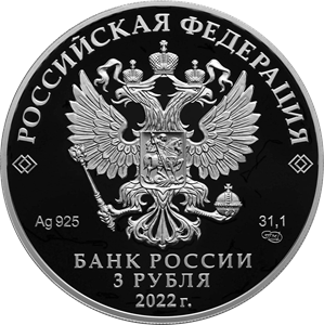 на зеркальном поле диска — рельефное изображение Государственного герба Российской Федерации, над ним вдоль канта — надпись полукругом: «РОССИЙСКАЯ ФЕДЕРАЦИЯ», обрамленная с обеих сторон сдвоенными ромбами, внизу под гербом: слева — обозначения драгоценного металла и пробы сплава, справа — содержание химически чистого металла и товарный знак монетного двора, внизу в центре в три строки — надпись: «БАНК РОССИИ», номинал монеты: «3 РУБЛЯ», год выпуска: «2022 г.».