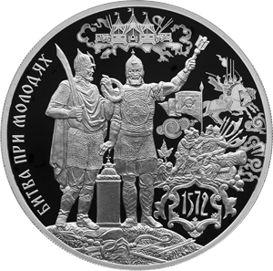 Серебряная монета 3 рубля "450-летие битвы при Молодях" 2022г., 31,1 г. 925 проба, ПРУФ