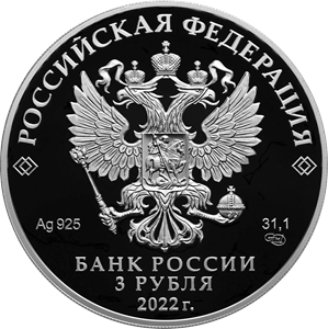 рельефное изображение Государственного герба Российской Федерации, над ним вдоль канта — надпись полукругом: «РОССИЙСКАЯ ФЕДЕРАЦИЯ», обрамленная с обеих сторон сдвоенными ромбами, под гербом: слева — обозначения драгоценного металла и пробы сплава, справа — содержание химически чистого металла и товарный знак монетного двора, внизу в центре в три строки — надпись: «БАНК РОССИИ», номинал монеты: «3 РУБЛЯ», год выпуска: «2022 г.».