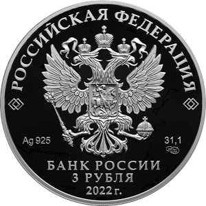 рельефное изображение Государственного герба Российской Федерации, над ним вдоль канта — надпись полукругом: «РОССИЙСКАЯ ФЕДЕРАЦИЯ», обрамленная с обеих сторон сдвоенными ромбами, под гербом: слева — обозначения драгоценного металла и пробы сплава, справа — содержание химически чистого металла и товарный знак монетного двора, внизу в центре в три строки — надпись: «БАНК РОССИИ», номинал монеты: «3 РУБЛЯ», год выпуска: «2022 г.».