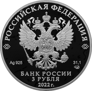 на зеркальном поле диска — рельефное изображение Государственного герба Российской Федерации, над ним вдоль канта — надпись полукругом: «РОССИЙСКАЯ ФЕДЕРАЦИЯ», обрамленная с обеих сторон сдвоенными ромбами, внизу под гербом: слева — обозначения драгоценного металла и пробы сплава, справа — содержание химически чистого металла и товарный знак монетного двора, внизу в центре в три строки — надпись: «БАНК РОССИИ», номинал монеты: «3 РУБЛЯ», год: «2022 г.».