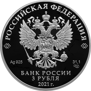 на зеркальном поле диска — рельефное изображение Государственного герба Российской Федерации, над ним вдоль канта — надпись полукругом: «РОССИЙСКАЯ ФЕДЕРАЦИЯ», обрамленная с обеих сторон сдвоенными ромбами, внизу под гербом: слева — обозначения драгоценного металла и пробы сплава, справа — содержание химически чистого металла и товарный знак монетного двора, внизу в центре в три строки — надпись: «БАНК РОССИИ», номинал монеты: «3 РУБЛЯ», год выпуска: «2021 г.».