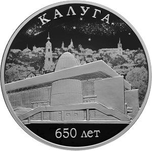 на зеркальном поле диска — рельефное изображение здания Государственного музея истории космонавтики им. К.Э. Циолковского на фоне изображений панорамы города Калуги и звездного неба; имеются надписи, вверху вдоль канта: «КАЛУГА», внизу: «650 ЛЕТ».