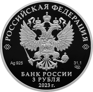 рельефное изображение Государственного герба Российской Федерации, над ним вдоль канта – надпись полукругом «РОССИЙСКАЯ ФЕДЕРАЦИЯ», обрамленная с обеих сторон сдвоенными ромбами, под гербом: слева – обозначения драгоценного металла и пробы сплава, справа – содержание химически чистого металла и товарный знак монетного двора, внизу в центре в три строки – надпись «БАНК РОССИИ», номинал монеты «3 РУБЛЯ», год выпуска «2023 г.».