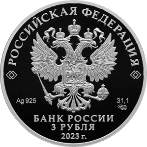 рельефное изображение Государственного герба Российской Федерации, над ним вдоль канта – надпись полукругом «РОССИЙСКАЯ ФЕДЕРАЦИЯ», обрамленная с обеих сторон сдвоенными ромбами, под гербом: слева – обозначения драгоценного металла и пробы сплава, справа – содержание химически чистого металла и товарный знак монетного двора, внизу в центре в три строки – надпись «БАНК РОССИИ», номинал монеты «3 РУБЛЯ», год выпуска «2023 г.».