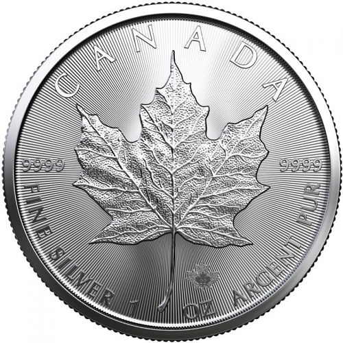 Аверс: В центре - рельефное изображение кленового листа. По окружности надписи: CANADA (Канада), характеристика металла 9999 FINE SILVER 1 OZ ARGENT PUR (чистое серебро 999 пробы, масса монеты 1 унция = 31,10 гр.).