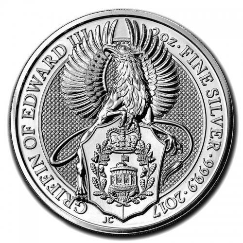 На реверсе серебряной инвестиционной монеты "Грифон" - изображение грифона. По кругу монеты - надписи на английском языке, обозначающие "Лев Англии 2 унции чистого серебря 0,9999 пробы». Здесь же указан год выпуска монеты - 2017, а также инициалы дизайнера монеты - JC (Jody Clark).