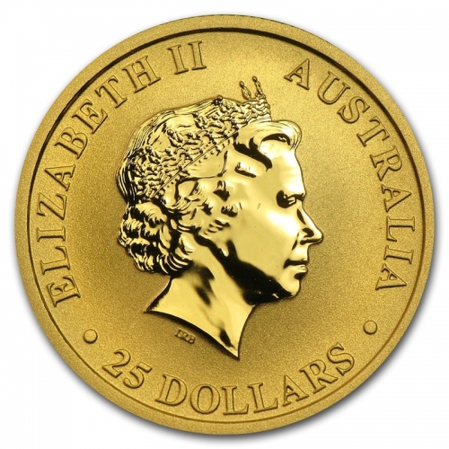 • На аверсе золотой монеты Австралийский кенгуру изображен портрет королевы Елизаветы II. Сверху надпись ELIZABETH II  — Елизавета II, AUSTRALIA — Австралия и год выпуска монеты. Внизу номинал монеты 25 DOLLARS. С нижней стороны портрета имеется надпись «IRB», обозначающая инициалы автора изображенного портрета – Иена Рэнка-Бродли.
