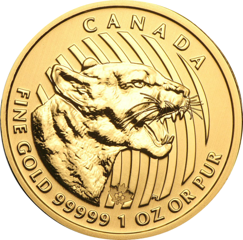 Реверс: изображена голова пумы (в профиль) с открытой пастью. С помощью дуговых параллельных линий дизайнер Пьер Ледук показал свирепое рычание хищника. Вверху полукругом выгравирована надпись – «CANADA». Внизу надписи – «FINE GOLD», «99999», «1 OZ», «OR PUR». Справа указаны инициалы дизайнера – «РL».