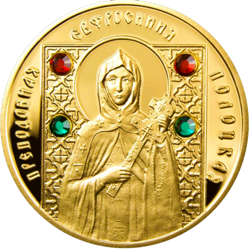 Реверс: вверху по кругу – надпись: ПРЕПОДОБНАЯ ЕВФРОСИНИЯ ПОЛОЦКАЯ; в центре – на фоне орнамента, применяемого в иконографии, со вставкой (четыре синтетических кристалла) – образ святой Преподобной Евфросинии Полоцкой.